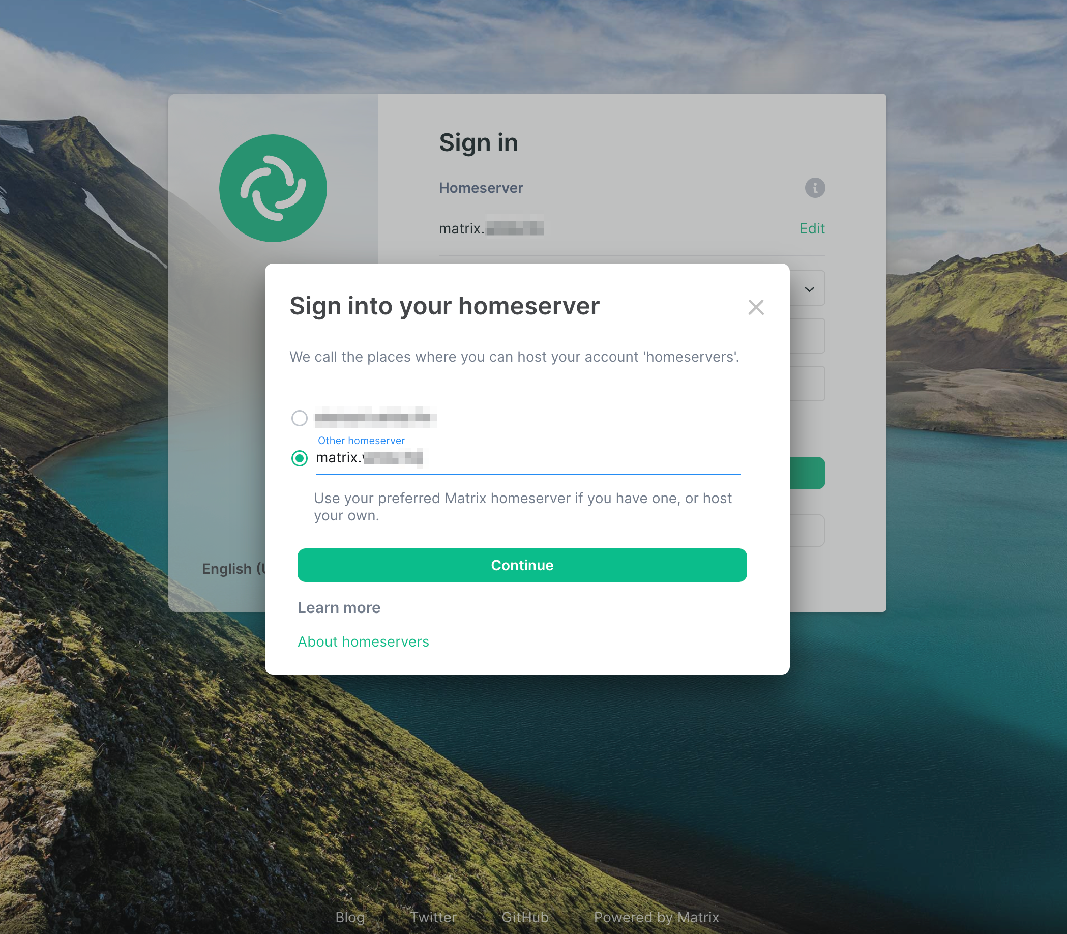 If all went according to plan, at this point, you should be able to access element.yourdomain.tld. Go there, and click Edit next to the auto-populated server name.