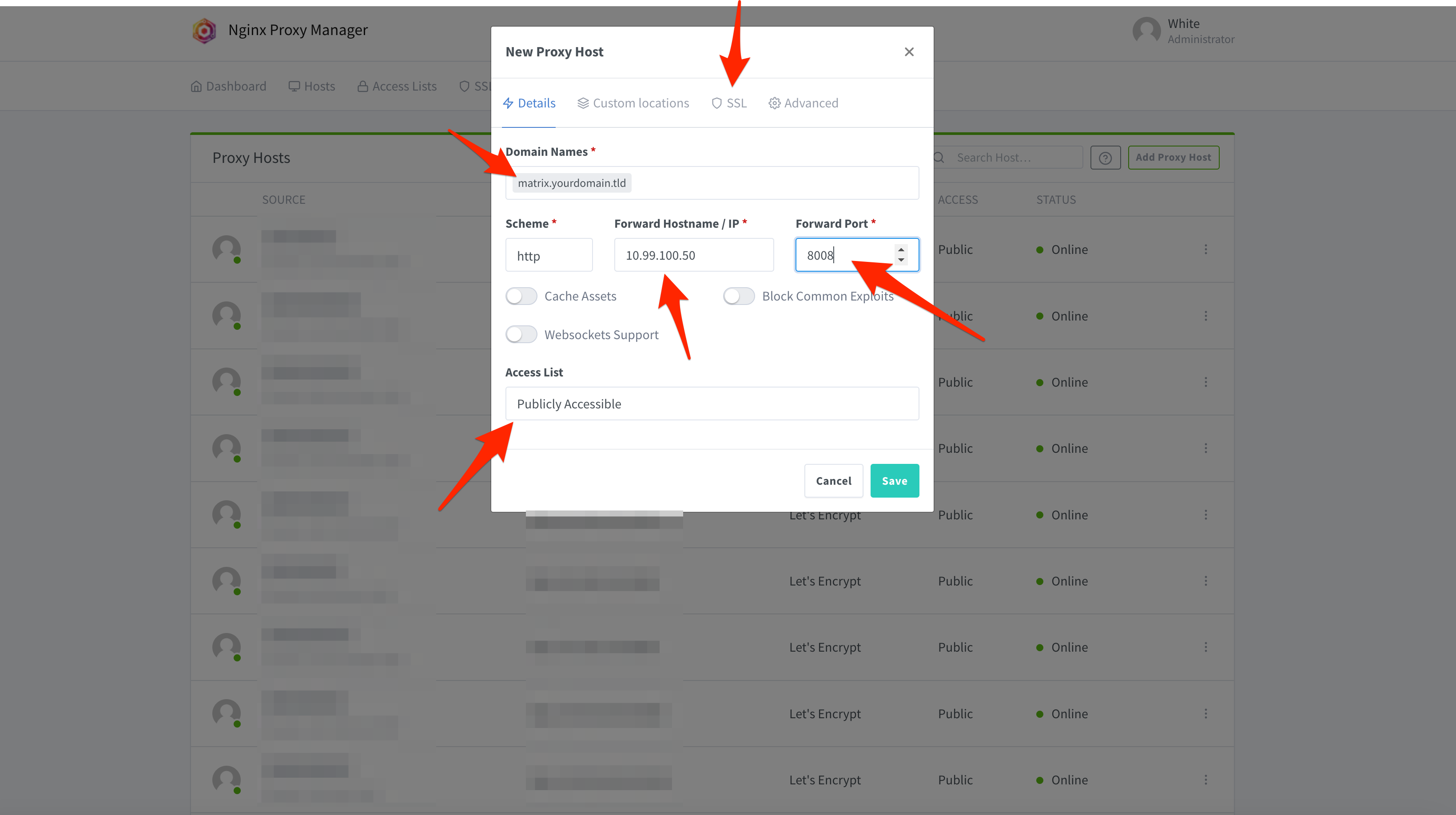 On the new screen, input matrix.yourdomain.tld under Domain Names, and input the local IP of your Matrix Server under Forward Hostname / IP. Next, input 8008 for the Forward Port. Then, click SSL.