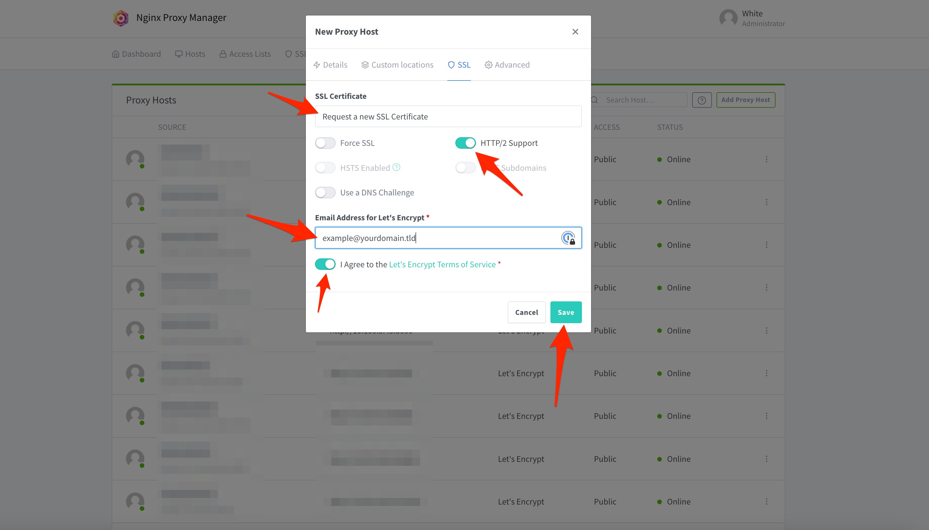 Here, under SSL Certificate, change the dropdown menu to Request a new SSL Certificate. Check HTTP/2 Support, and input your email address in the box Email Address for Let’s Encrypt. The email field is required, and the email address will be registered with Let’s Encrypt. Once filled in, click Save in the bottom right.