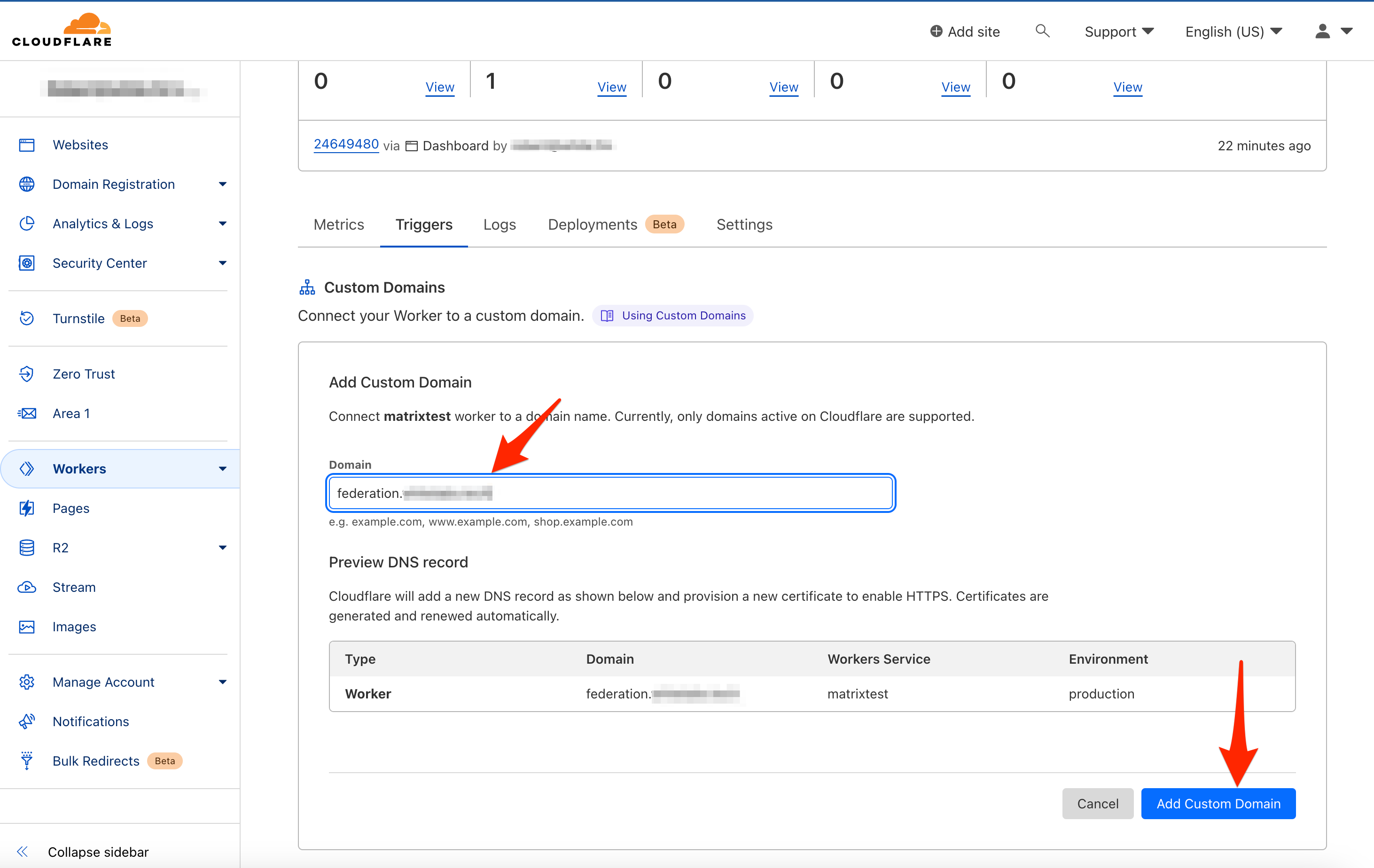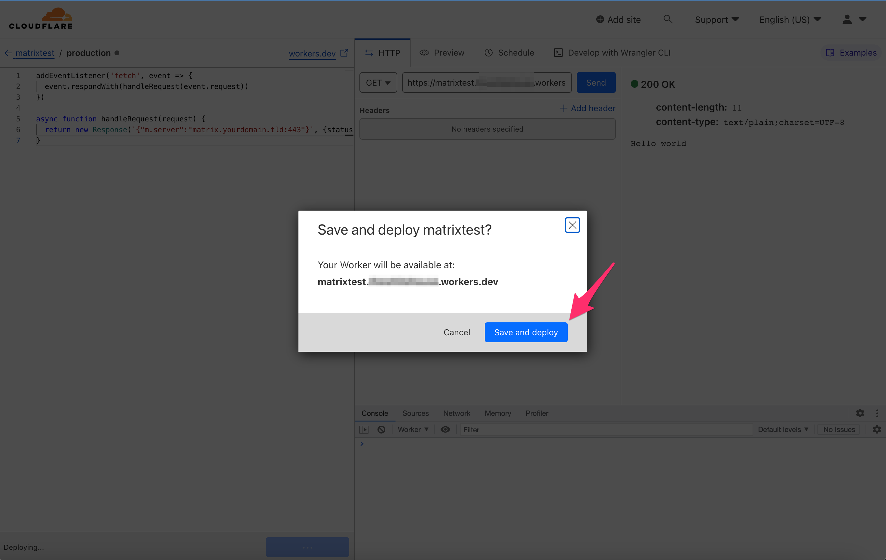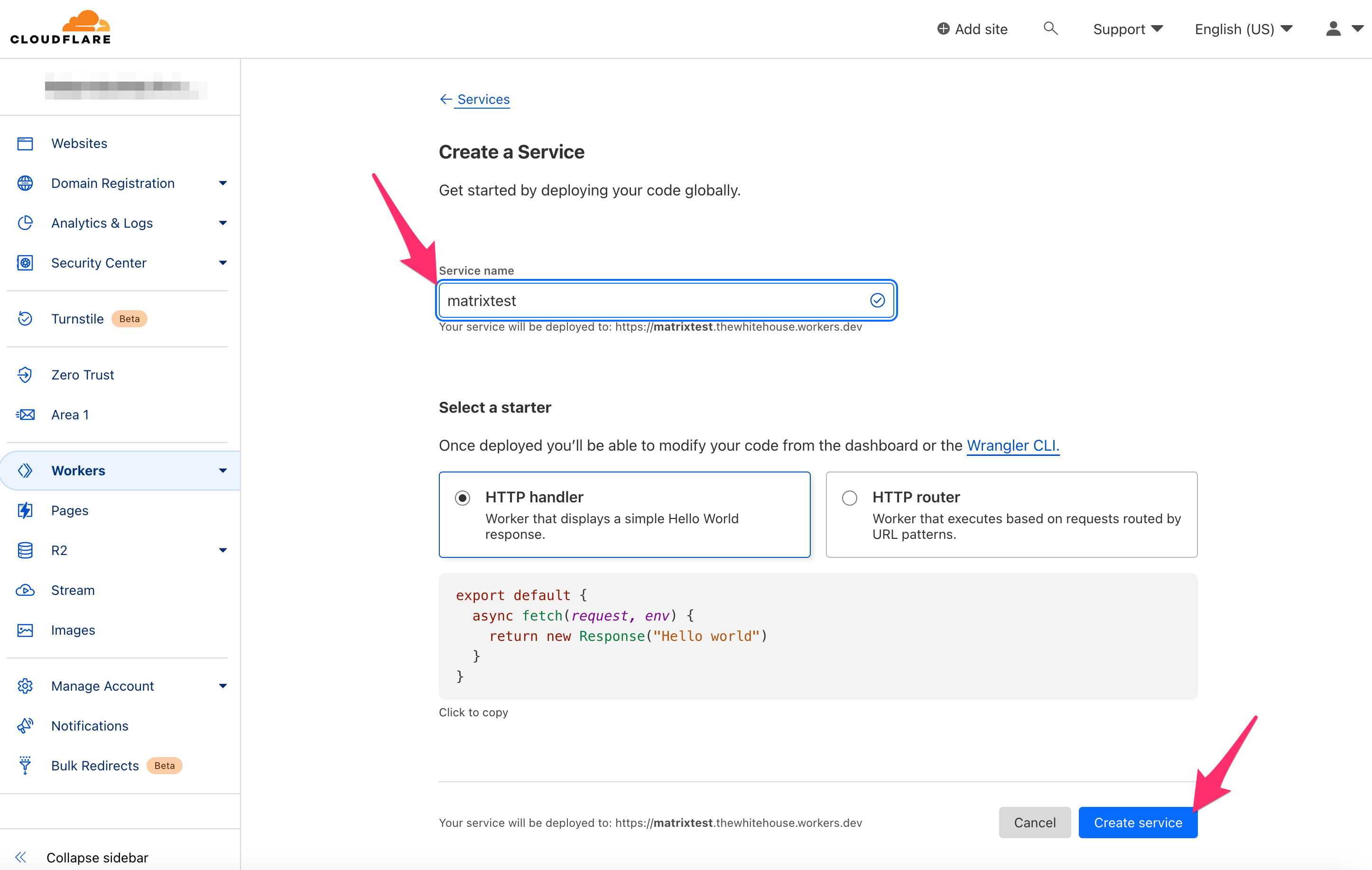 On your Cloudflare Dashboard, select Workers in the left navigation pane. Click Create a Service, and add a service name (e.g., matrix). Click Create service in the bottom right.