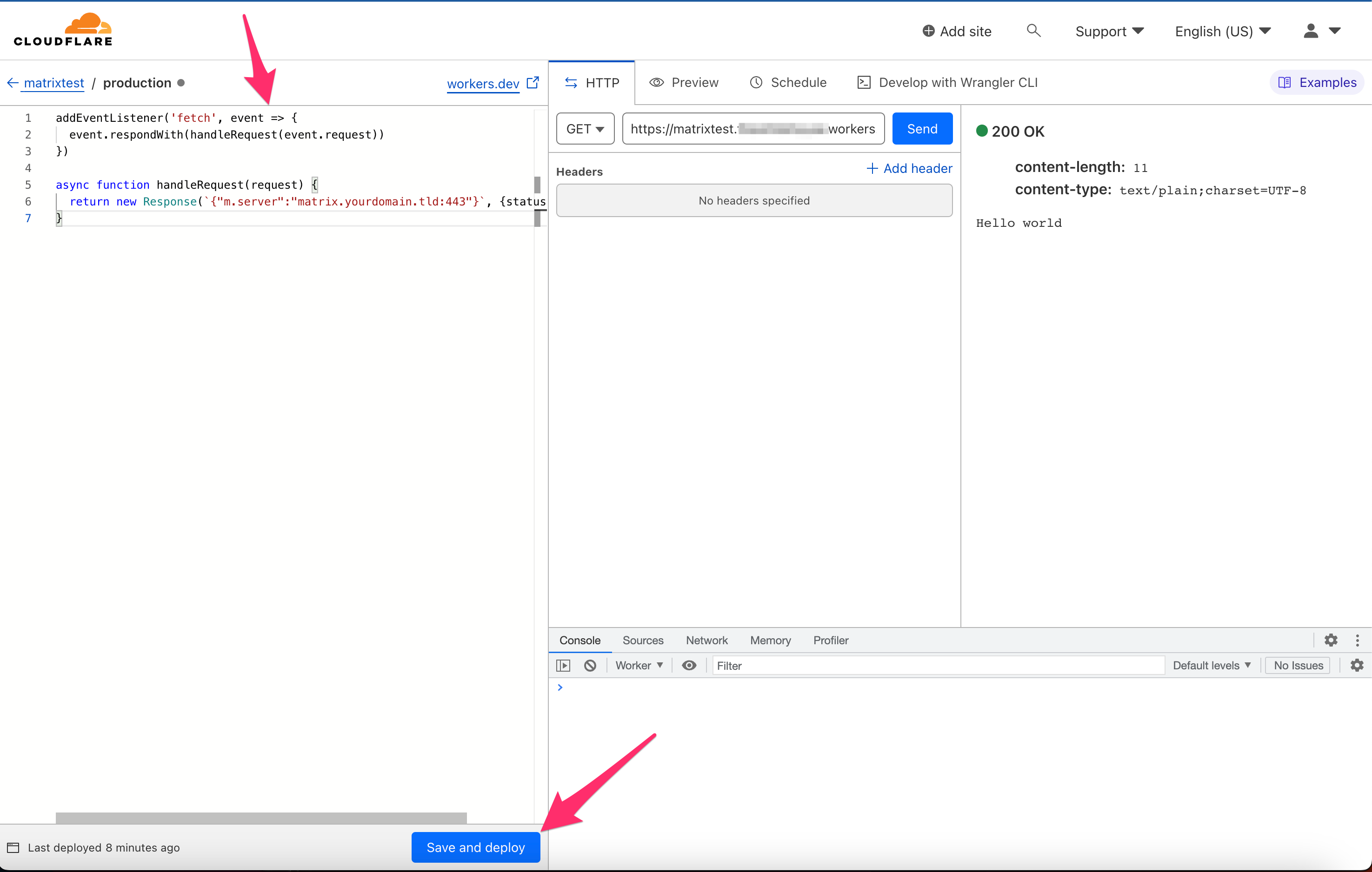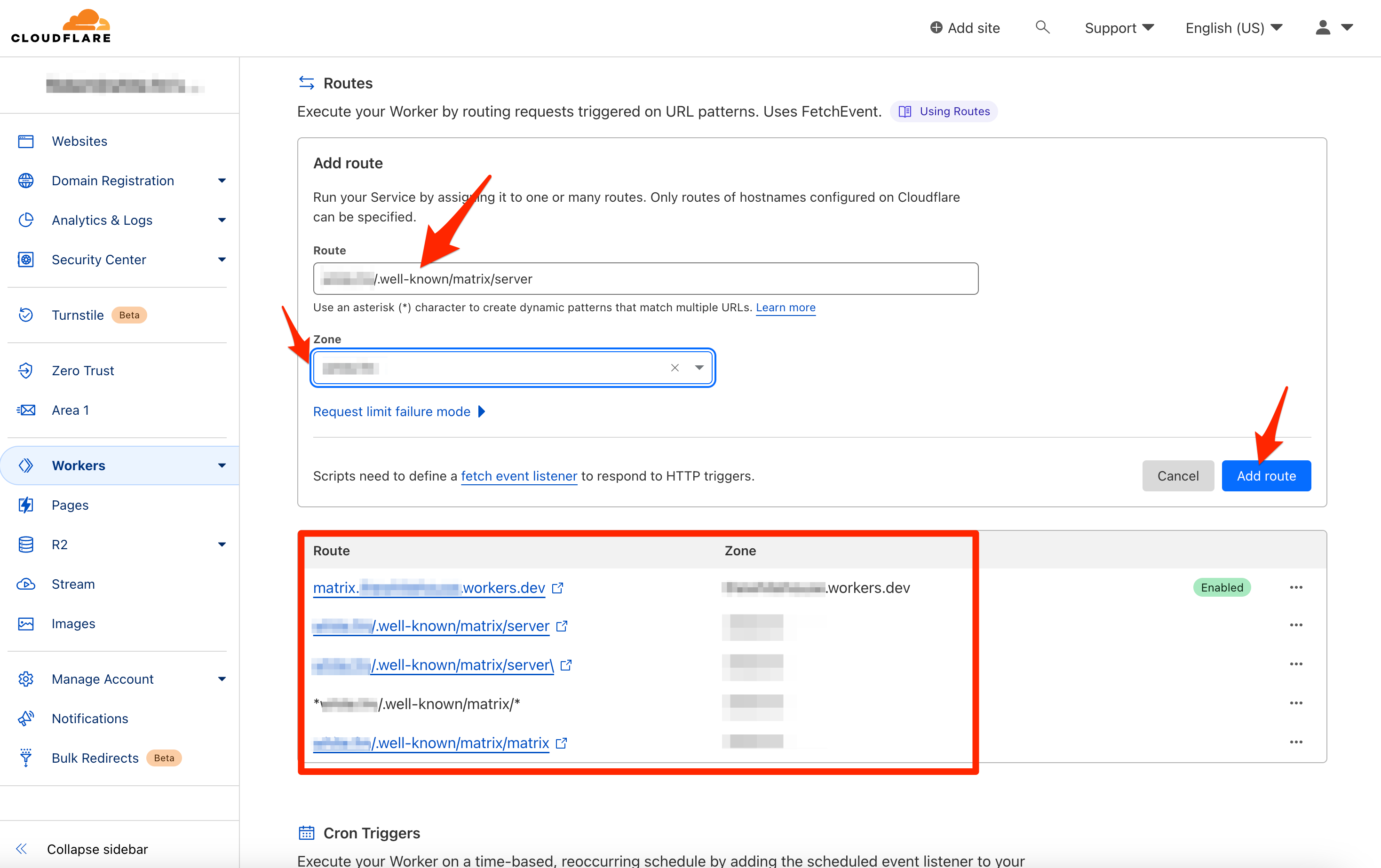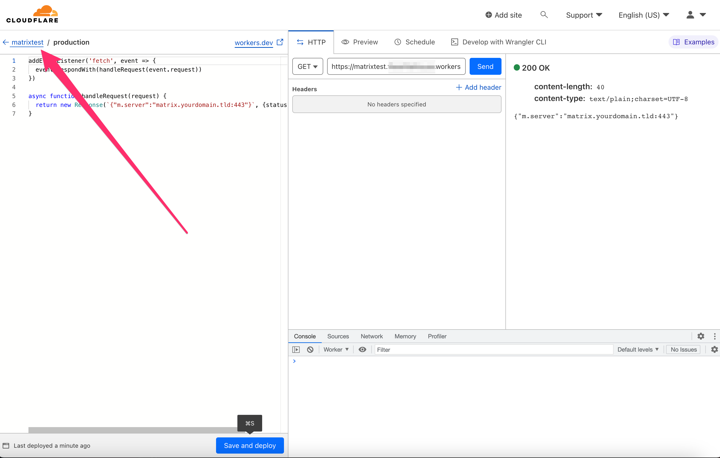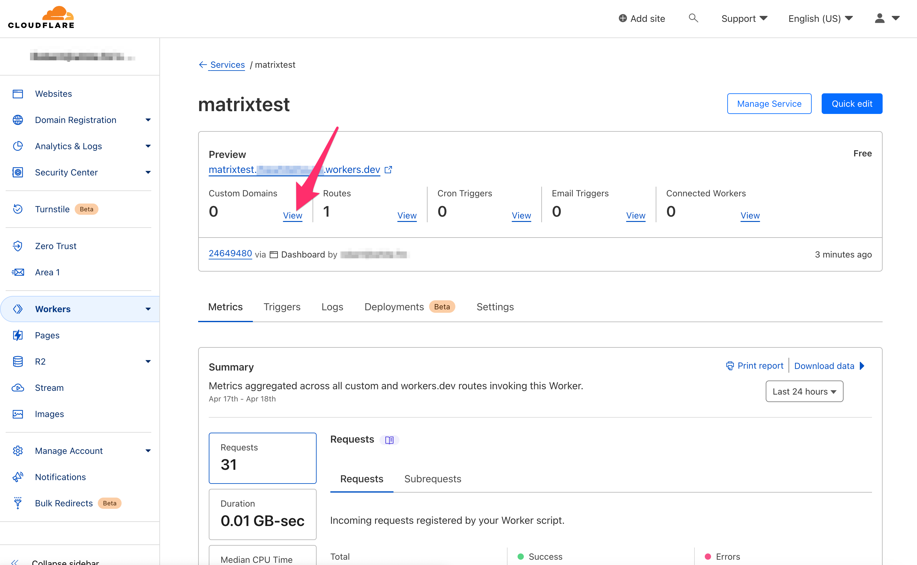 On your Cloudflare Dashboard, select Workers in the left navigation pane. Click Create a Service, and add a service name (e.g., matrix). Click Create service in the bottom right.
