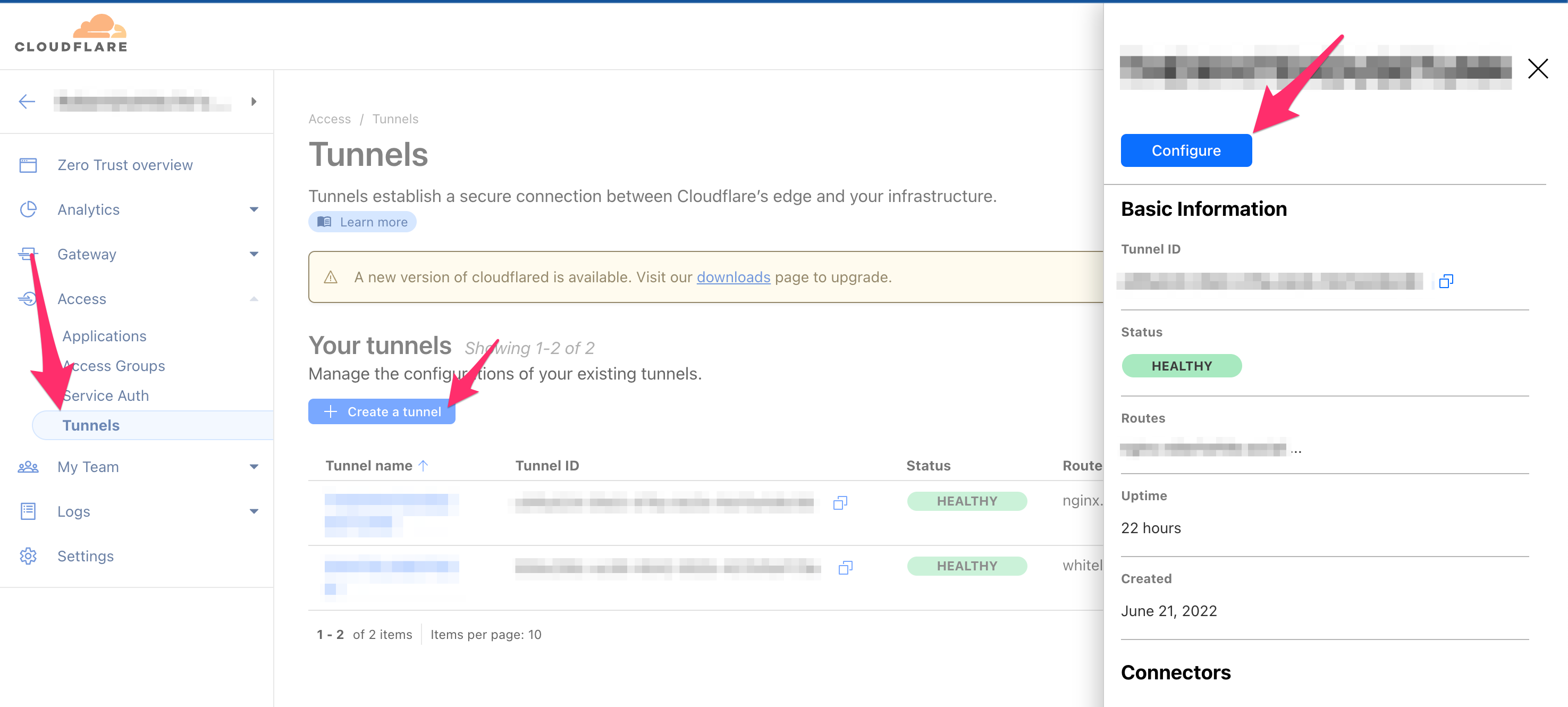 Go to Cloudflare’s Zero Trust Dashboard and click Access > Tunnels in the left navigation pane. Select the tunnel you will be using, and click Configure.
