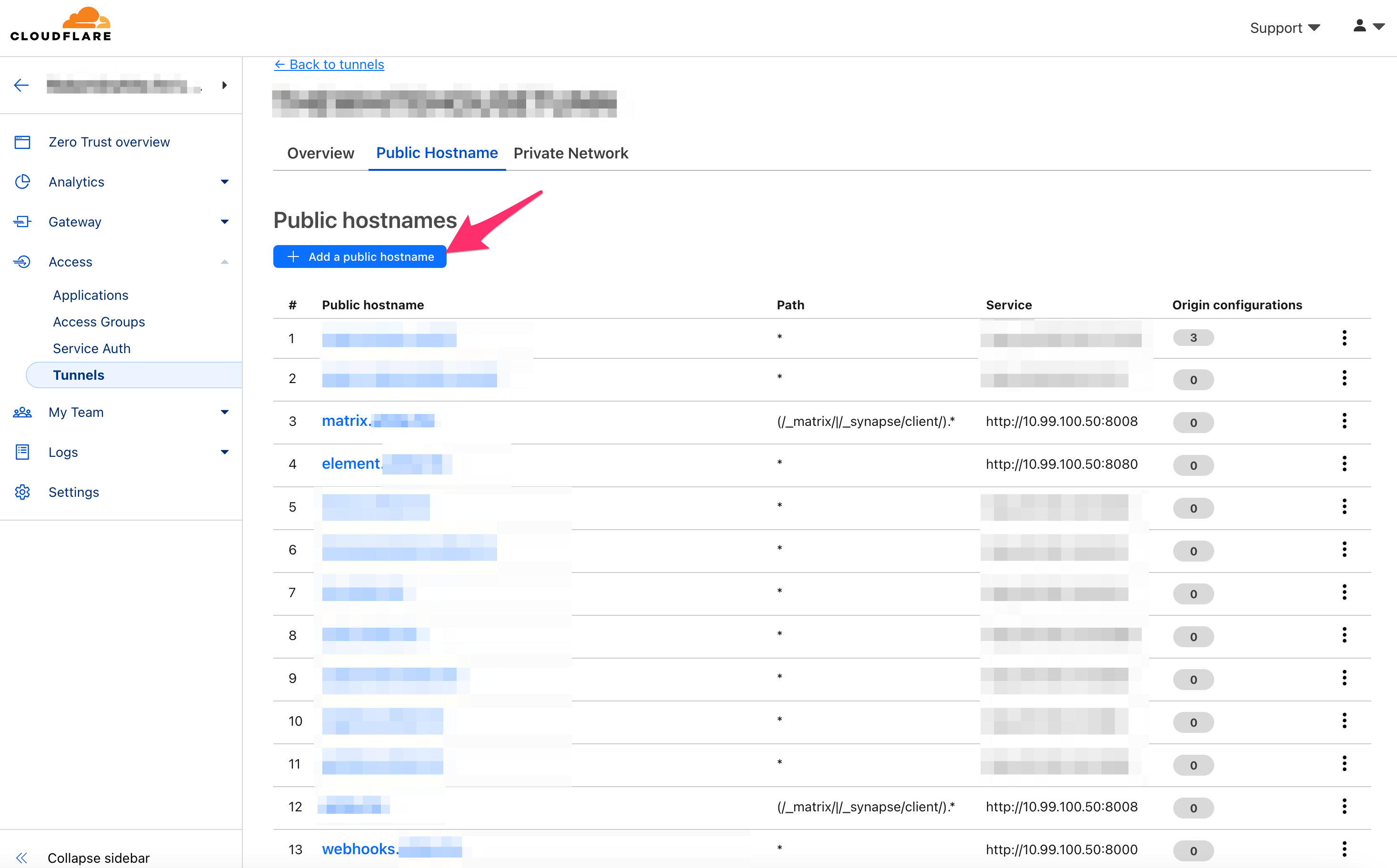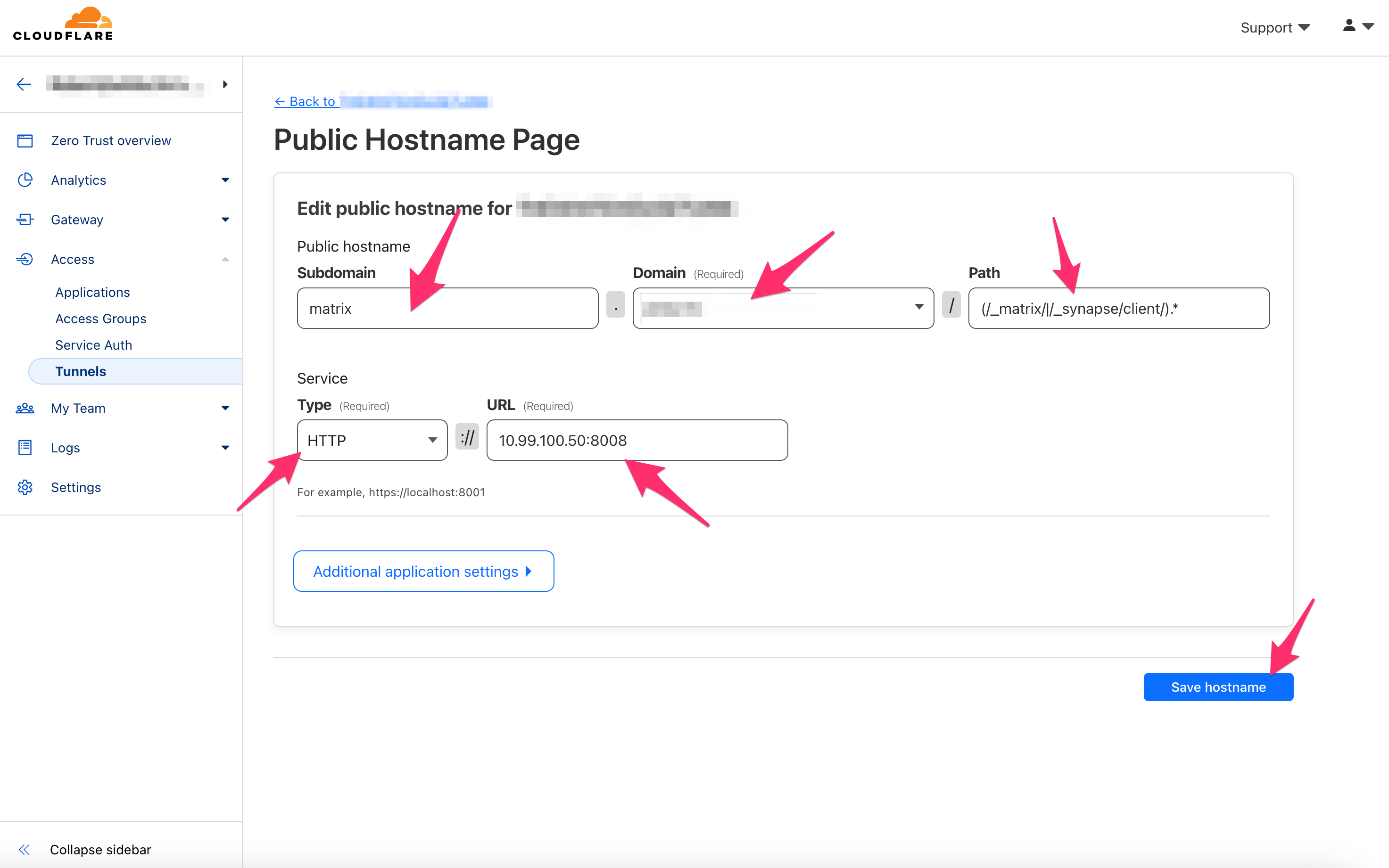 Now, we will add your matrix.yourdomain.tld to the tunnel. Click Add a public hostname. Under Subdomain, add “matrix”. For Domain, click the box and select your domain. For “Path”, enter the following: