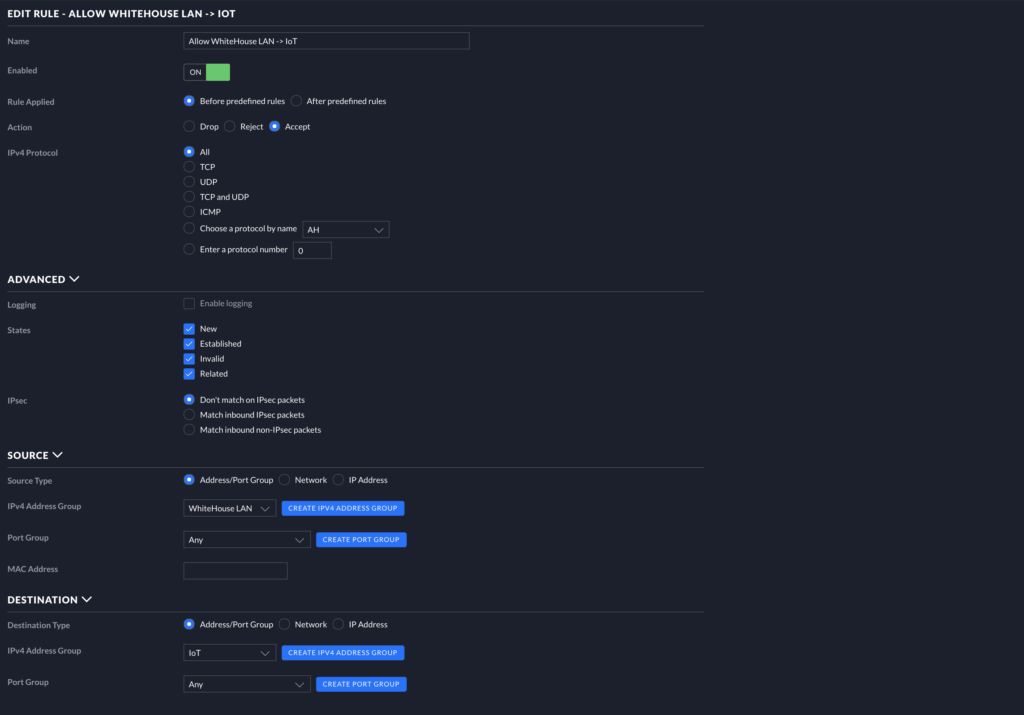 This portion can get complicated depending on how specific you want to be with allowances of devices between these network segments. I have a lot of different home automation programs running like HomeBridge and Home Assistant. I also have Sonos speakers, which need their own rules to function properly with your iPhone on a different subnet. If you have some IoT devices (no Sonos) without any external programs like HomeBridge, the only rules you will need to concern yourself with are 2003 and 2012.