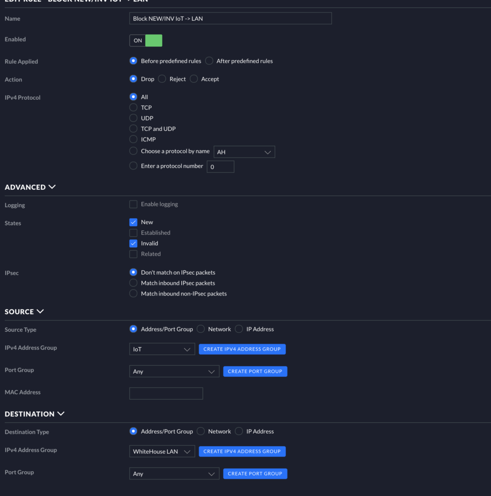 Next, let’s check out Rule 2012. Create a new rule and match to the image below. Note that Action Is set to Drop. Also, note the States that are checked are New and Invalid. This prevents traffic from flowing from the Source (IoT) to Destination (LAN) (traffic flow IoT ->X LAN) based on the status of the traffic. Only established and related traffic will be allowed, then.
