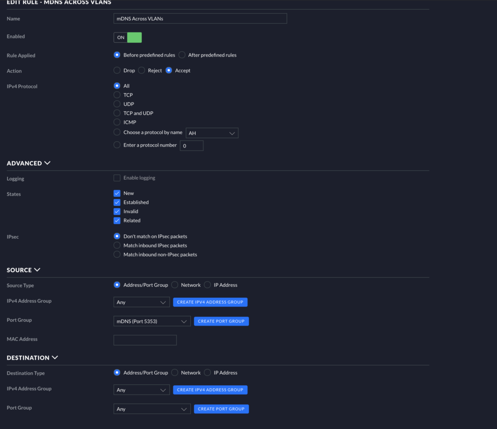 HomeKit I have a Port Group with ports 51826 and 51827 for HomeKit. Make your own rules and match your settings to the image below. All you will need to do is change your source/destination like in the image below (Rules 2000-2003) to allow HomeKit communications. You can more finely tune this particular rule by granularly allowing different source/destination combos (e.g., source: IoT, destination: home), but I am currently simply allowing any source/destination combo to communicate over HomeKit ports.