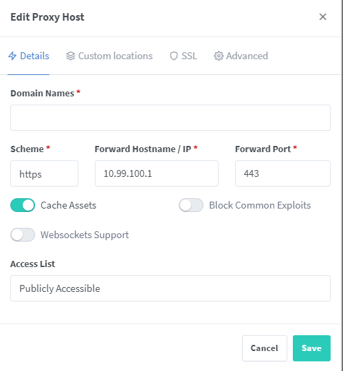 The config is relatively simple at this point. Check out the image below to see what the config should look like. Under “Domain Names,” add your domain (e.g., unifi.whitematter.tech). The “Scheme” should be “https” and the “Forward Hostname / IP” should be the local IP of your Unifi Dream Machine or other Unifi device (e.g., 192.168.1.1, 10.0.0.1). The “Forward Port” should be 443. I always check “Cache Assets.” Since Unifi devices are protected with Unifi account, I leave the “Access List” public. You can protect it with a username/password, but I recommend instead using a strong Unifi password, which is better in the long run anyway.