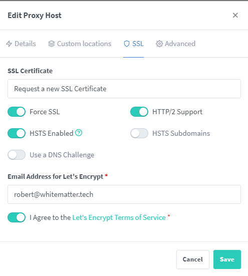 Now, click “SSL” in the top menu (see the next image below). Choose “Request a new SSL Certificate” and check the “Force SSL,” “HTTP/2 Support,” and “HSTS Enabled” options. Enter an email address (this is used to send to Let’s Encrypt to generate your cert), and finally agree to the Let’s Encrypt terms after reading them. Click “Save,” and you’re good to go!