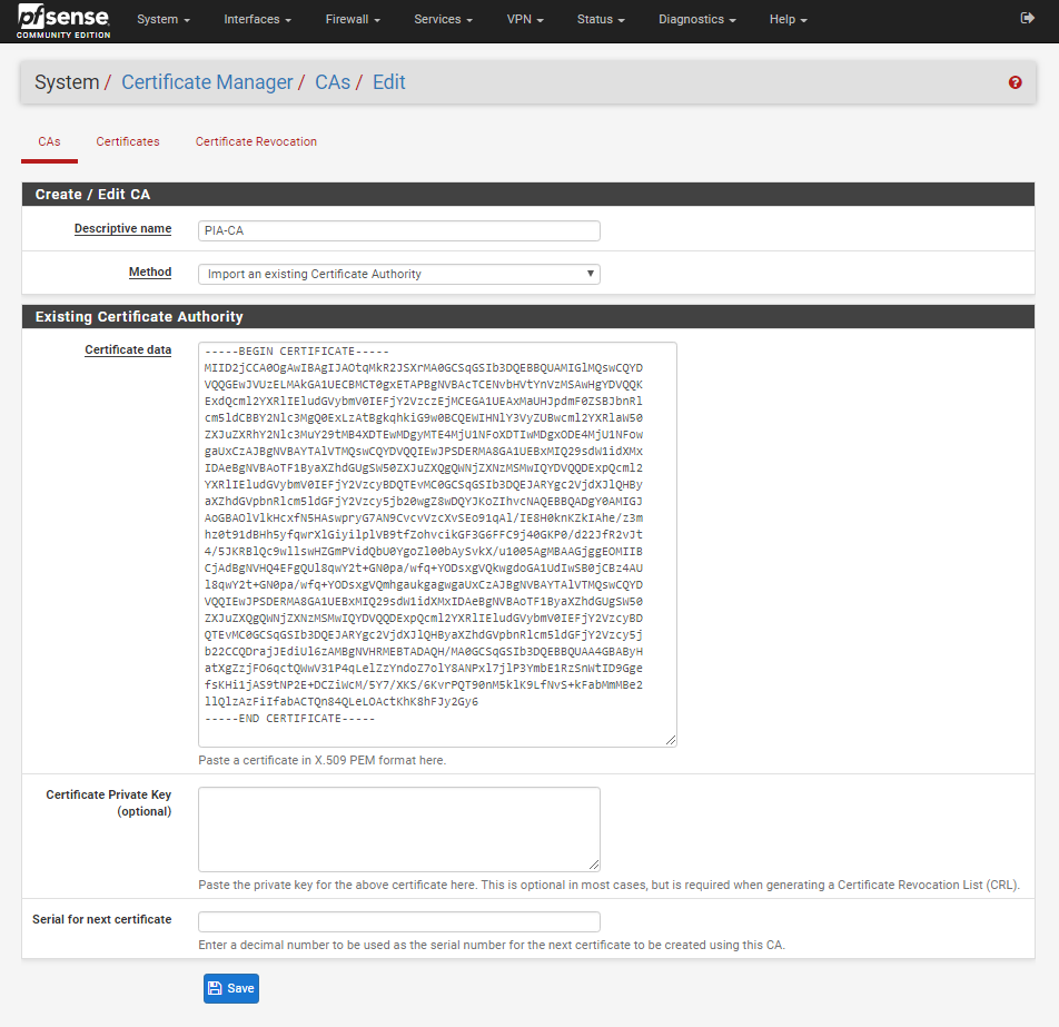 If you prefer to use the more secure 4096 RSA cert, grab the .CRT from here: https://www.privateinternetaccess.com/openvpn/ca.rsa.4096.crt