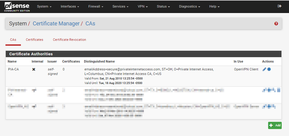 In pfSense, navigate to System > Cert Manager and click on the “+ ADD” Button. Change the “Method” to “Import an existing certificate authority” and paste the copied certificate text into the box. It should look like below: