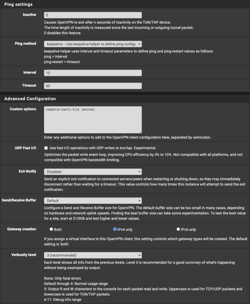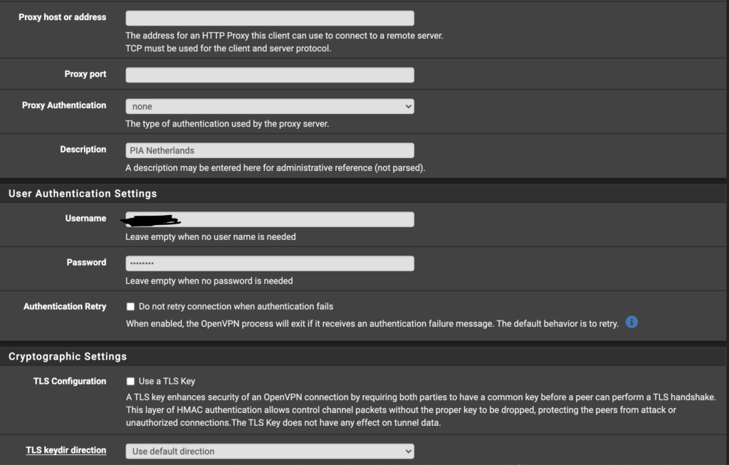 See the following images about changes to make in. your configuration. It should match mine with replacement of the Server Host and your PIA Username and Password. You will find the server host in the .ovpn file you downloaded earlier from PIA. Here is the info needed to copy+paste into the “Custom options” box toward the end of the configuration page: