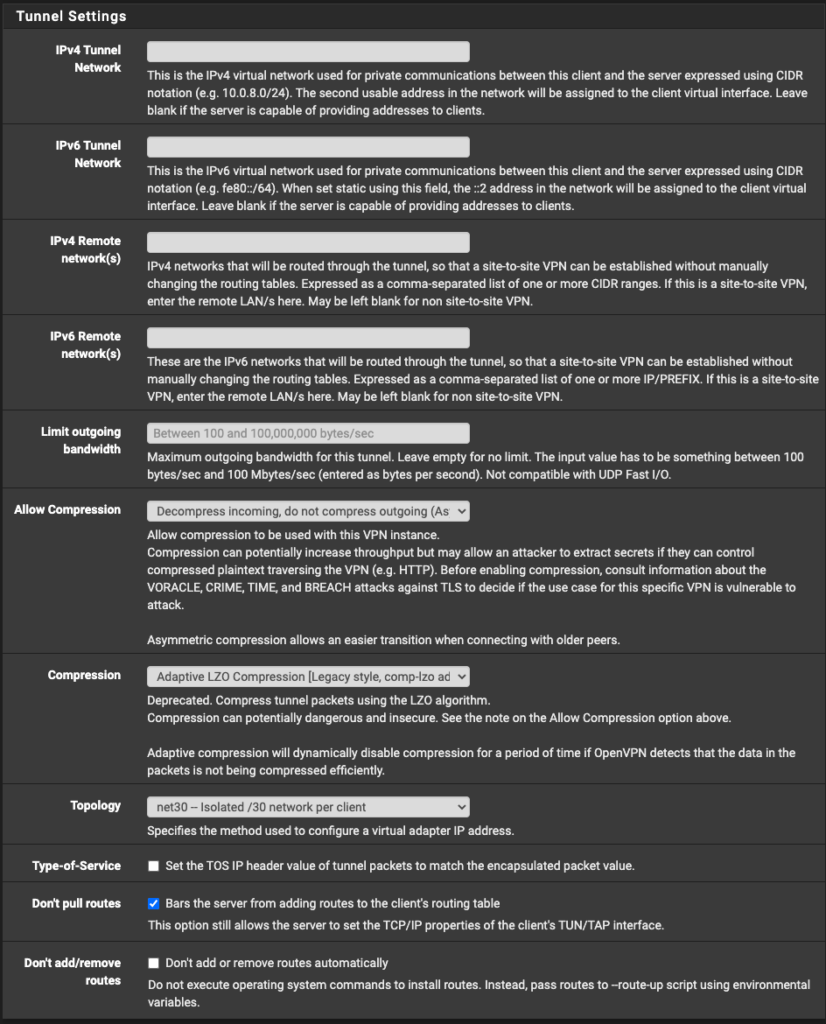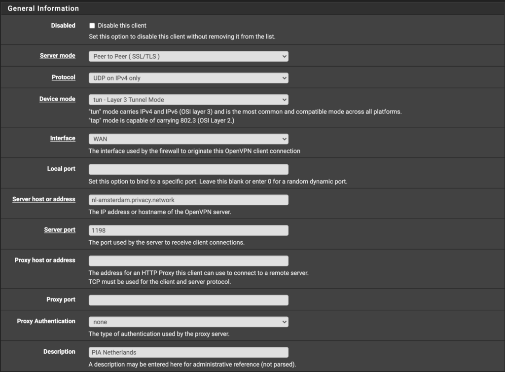This post assumes that you have the following: a Unifi Gateway device (e.g., UDMP, Unifi Security Gateway, etc.), a pfSense machine/VM, Unifi wireless APs (only if you want to add wireless devices to the VPN), and Unifi switches (only if you want to tag specific switch ports to the VPN). This post also assumes you have access to or a subscription to a VPN service. In this post, all references to VPN use will be specific to PIA. This guide may or may not work with other VPN providers initially. However, I am confident that, if you can initialize the client connection to your VPN provider from pfSense, you will be able to successfully use the tutorial to anonymous traffic with Unifi VLANs. We will first look at the pfSense setup and VPN configuration. After, we will explore the Unifi setup and configuration.