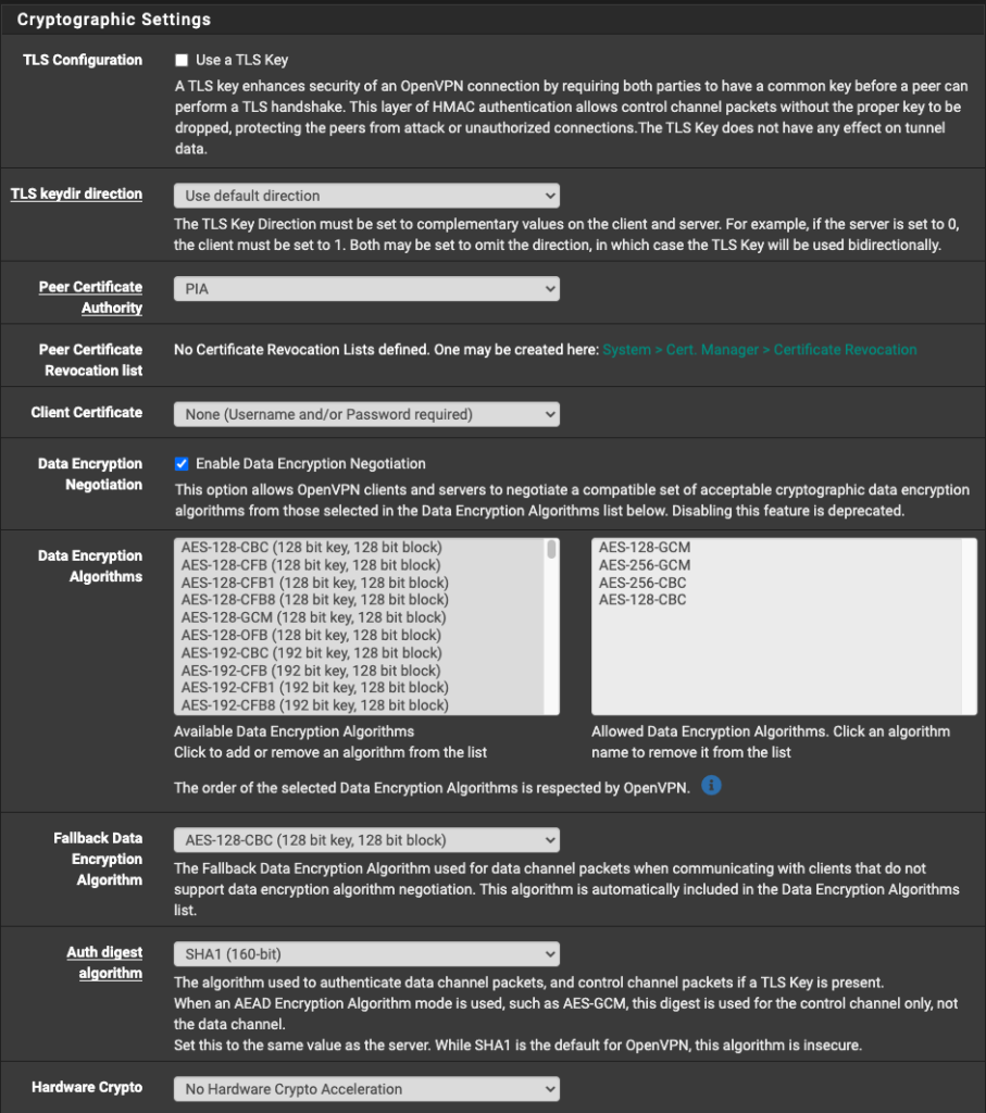 This update contains specific configuration options to use 4096 bit RSA keys, SHA256 Auth digest algorithm, and AES256 encryption. The original post used the default key length of 2048 from PIA, SHA1, and allowed for AES128.