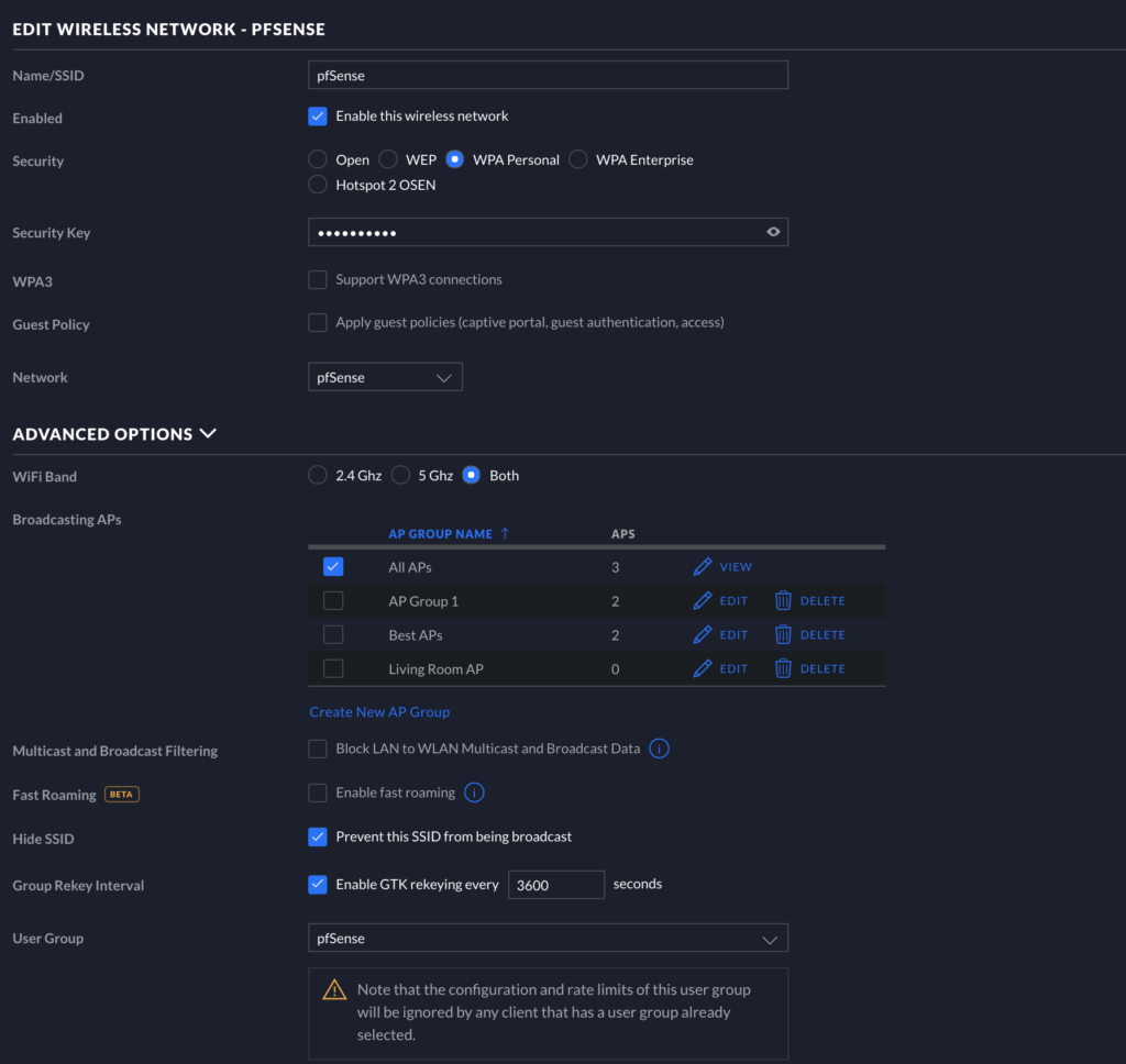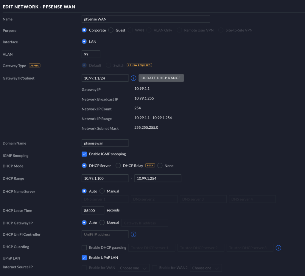 Make a new Corporate LAN on Unifi for your pfSense WAN, and match the options to the options in the image below. Make sure your subnet matches the subnet added to pfSense earlier for the WAN interface.