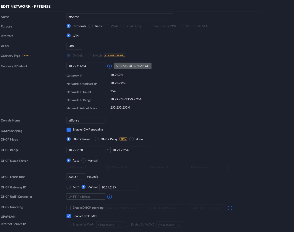 Make another Corporate LAN in Unifi. Below is my settings page for the pfSense LAN. You can match your settings to mine. Be sure to set the DHCP Gateway IP to the static IP address you gave to the pfSense LAN Interface earlier (e.g., 10.99.2.15). Also be sure to add THE SAME VLAN as you did in pfSense earlier (e.g., VLAN 500).