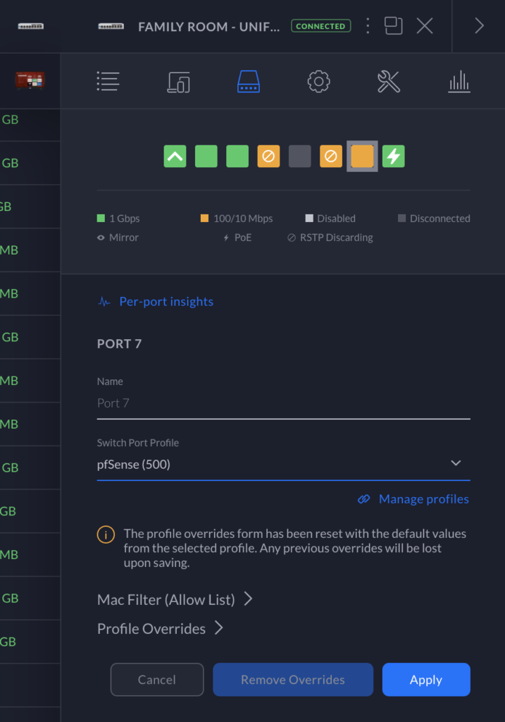 This should bring up a page that allows you to specifically override the configuration of that port. At this point, select the new pfSense (500) Port Profile (if the Port Profile is not here, please skip to the end of the article to find out how to add the profile). Once you apply the configuration, your device will obtain a new DHCP lease from Unifi in the new pfSense subnet. Then, your wired device will be sending its traffic through PIA.