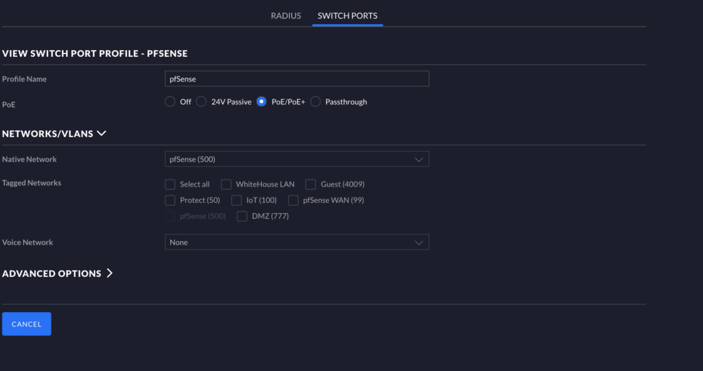 If for some reason the Port Profile was not made automatically when you created your respective networks, you may need to go to Settings > Profiles in the Unifi dashboard. On this page, switch from RADIUS to SWITCH PORTS. Click “ADD NEW PORT PROFILE.” Name the Profile and then click Native Network, and assign the pfSense network to this profile as shown below. Once selected, click Save/Apply. You can return to the assignment area and assign ports appropriately to use the pfSense VPN.