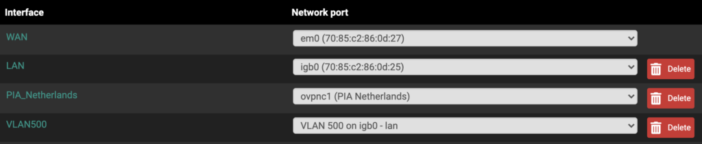 Now, we move to the complicated part. For this step, we will need to create a Gateway on pfSense for the traffic to use. I will detail this more later, but my setup contains a WAN (corresponding to a 10.99.1.0/24 subnet on Unifi), LAN (corresponding to a 10.99.2.0/24 subnet on Unifi), VLAN500 (which is the VLAN tag on my Unifi setup) and PIA interface. I will detail the setup of each, which will move us to the Unifi setup.