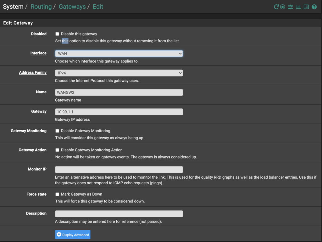First, go to System > Routing > Gateways and click "+ Add" to add a Gateway for this setup. Add the Gateway IP from your Unifi Gateway, which, in my case, the Gateway IP is 10.99.1.1 corresponding to the Unifi UDMP’s address in that subnet (subnet is 10.99.1.0/24, named pfSense WAN on Unifi). Save and continue.