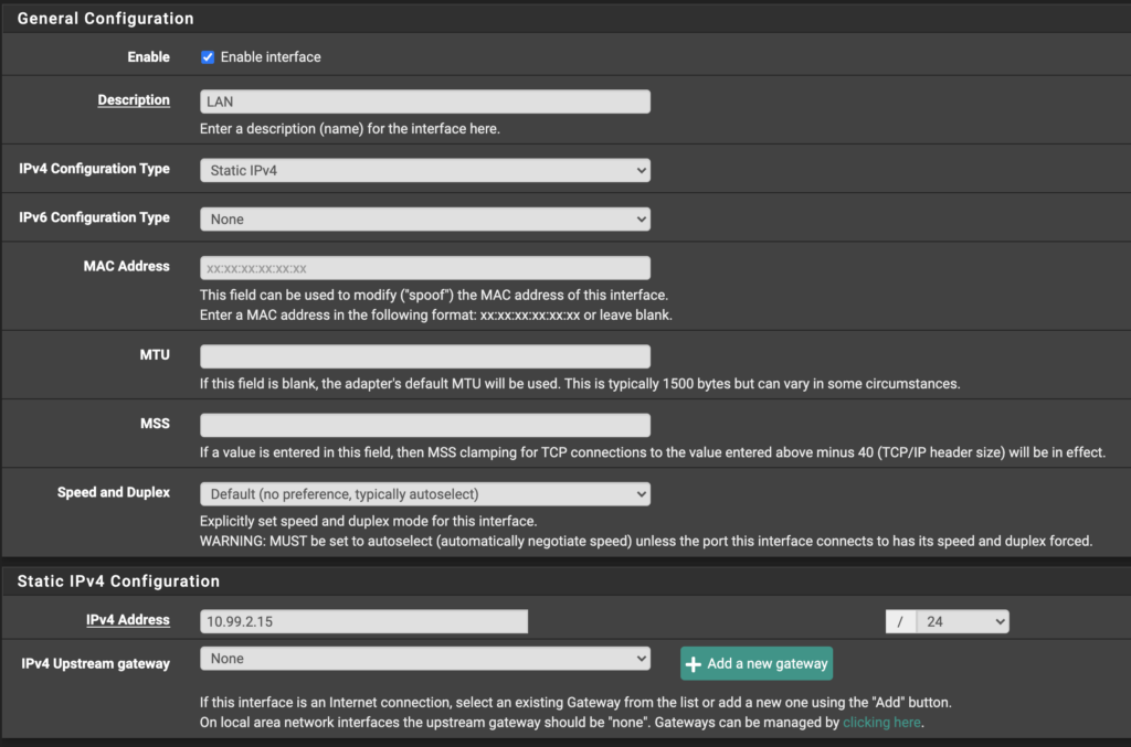 Likewise, check your existing LAN interface, if it exists, or create one as follows below. The LAN interface corresponds to the 10.99.2.0/24 subnet, where devices tagged with the VLAN 500 will go and retrieve their DHCP lease on Unifi. Again, I set my LAN interface IP to 10.99.2.15 because it seemed easy to remember for me. Make sure the IPv4 Upstream gateway is set to “None.” DO NOT block bogon networks on the LAN interface.