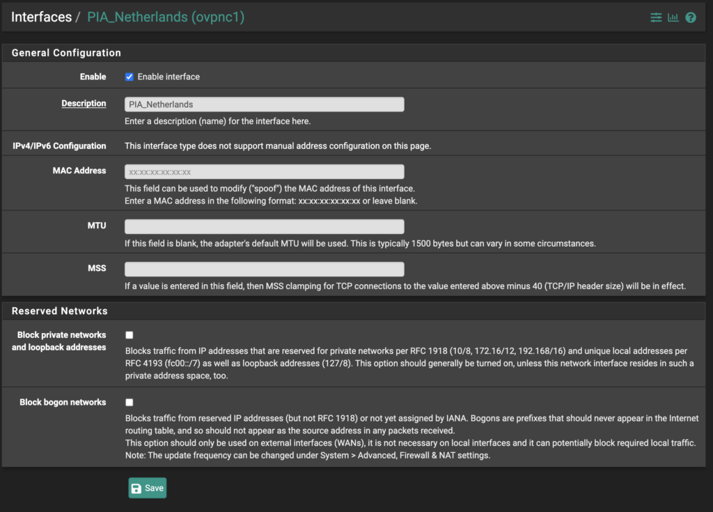 Now that the interface has been added, click on the interface name (it will likely be something like OPT2 or OPT3, but yours may be different…it should be at the bottom of the list). Now you can check the box to enable the interface and give it a better name, I called mine PIA_Netherlands. Also, make sure the reserved network checkboxes are unchecked.