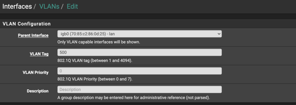 Finally, go to Interfaces > VLANs and add a VLAN. Here, choose your previously configured LAN interface as the parent interface, and choose a VLAN tag between 1 and 4094. This tag will be used in Unifi. I chose 500.