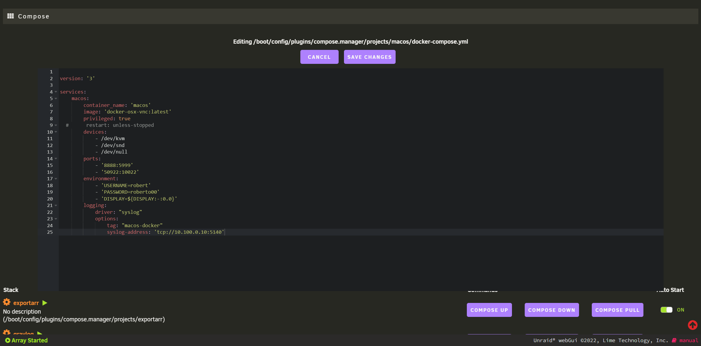 Select SAVE CHANGES, and simply click COMPOSE UP to start your new MacOS container. A Docker container will be created, and you will see your new container with the rest of your Unraid containers in the GUI. You can access the container’s logs and console from the GUI like the rest of your Unraid containers.