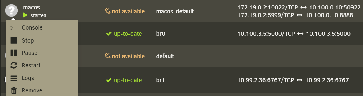 Before connecting to the container, you will need to retrieve the generated VNC password. To do this, on Unraid, find the container you created called macos, click it, and click "Console" as shown in the image below: