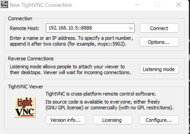 In order to connect to the container, you will need a VNC client supporting the specific TigerVNC server the container is using. My VNC client of choice on Windows is TightVNC Client. Download and install the TightVNC Client. After installing and opening, type the IP of your container followed by "::8888", as shown in the image below: