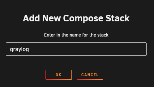 Select ADD NEW STACK and name the stack something obvious like “graylog”, like shown in the image below.